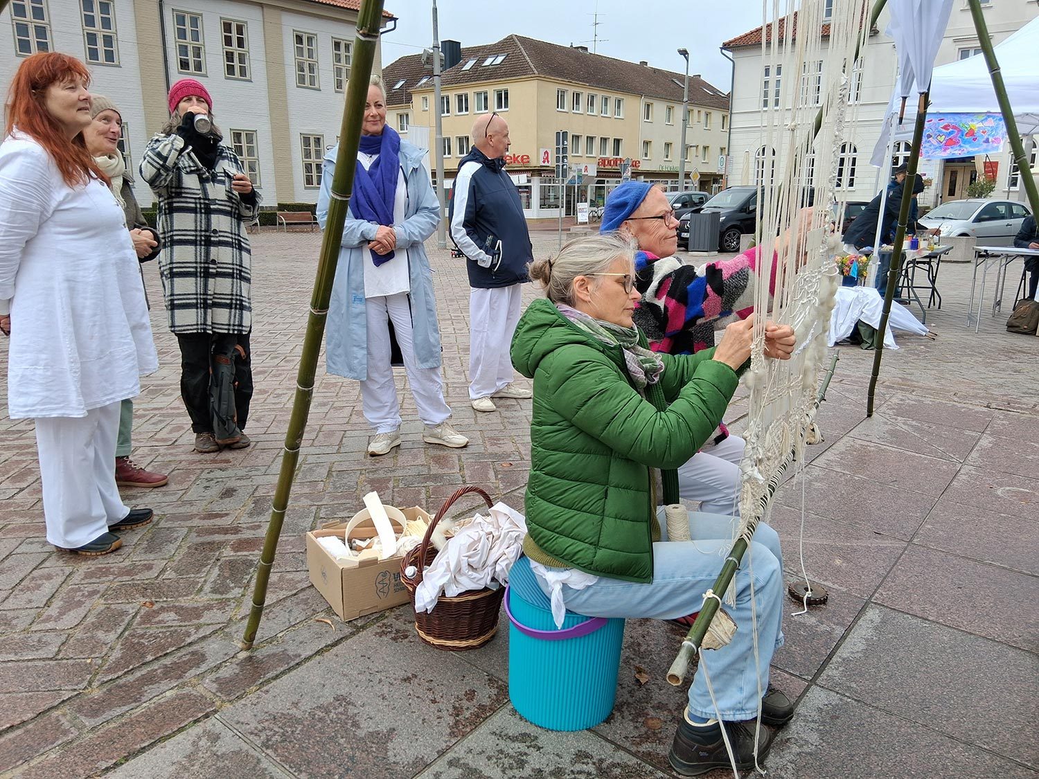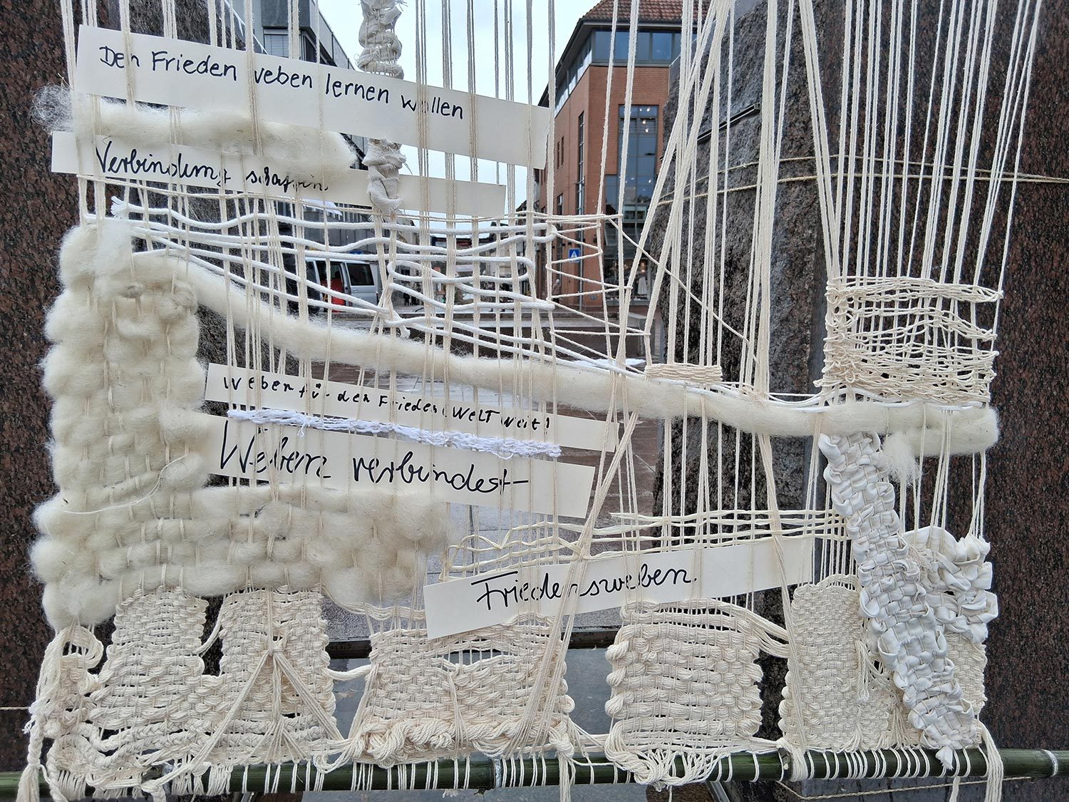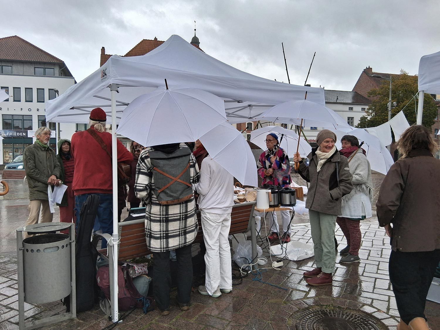 Unser Fest für den Frieden mit Installationen, Weben, Tanz, Musik, Gesang, Malen und Speisen war ein fröhliches Zusammenkommen von vielen friedliebenden Menschen. Dem widrigen Wetter mit heftigen Windböen und Regenschauern wurde mit weißen Schirmen und Zusammenrücken unter den Festpavillions begegnet. Wir danken allen, die zum Gelingen des Festes beigetragen haben.