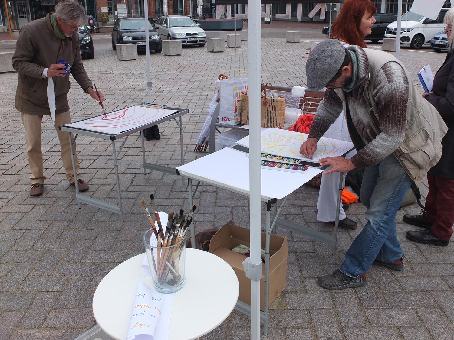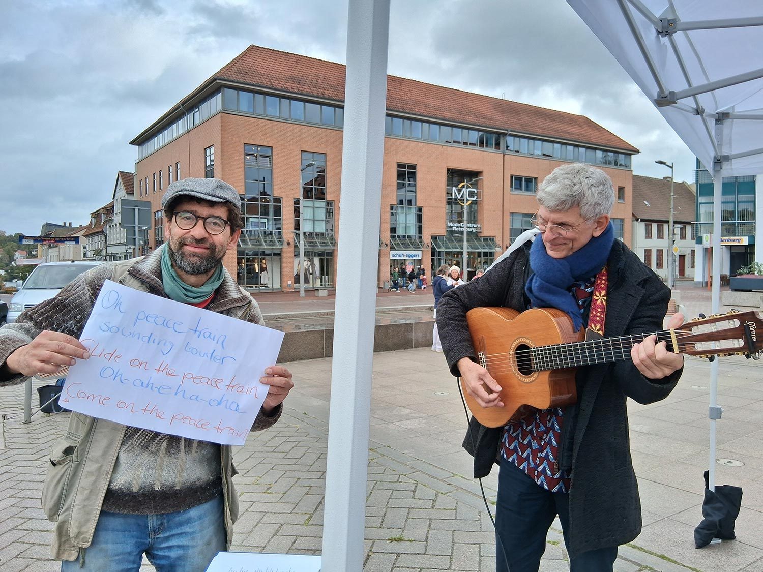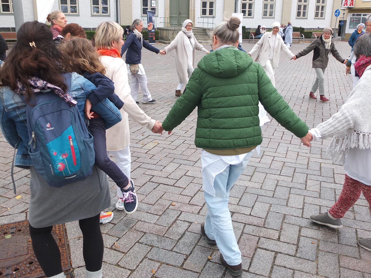 Unser Fest für den Frieden mit Installationen, Weben, Tanz, Musik, Gesang, Malen und Speisen war ein fröhliches Zusammenkommen von vielen friedliebenden Menschen. Dem widrigen Wetter mit heftigen Windböen und Regenschauern wurde mit weißen Schirmen und Zusammenrücken unter den Festpavillions begegnet. Wir danken allen, die zum Gelingen des Festes beigetragen haben.